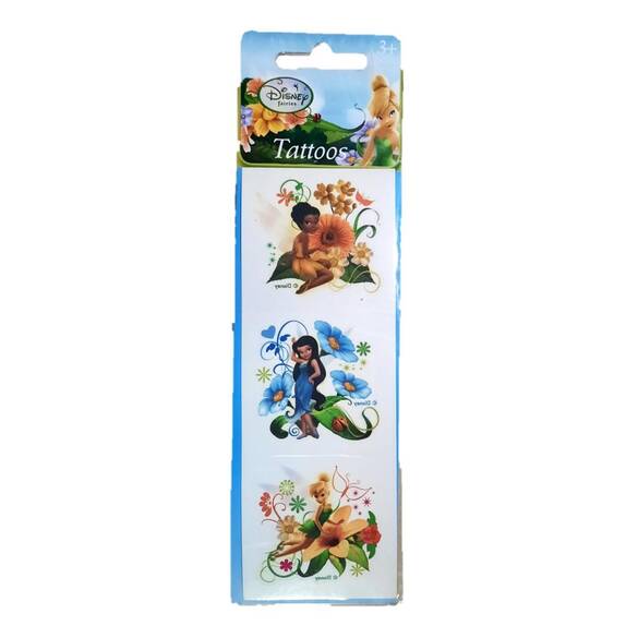 Disney Fairies geçici dövme seti. Disney perilerinden Iridessa, Silvermist ve Tinkerbell karakterlerinin dövmelerini içerir. Cilde tamamen zararsızdır.