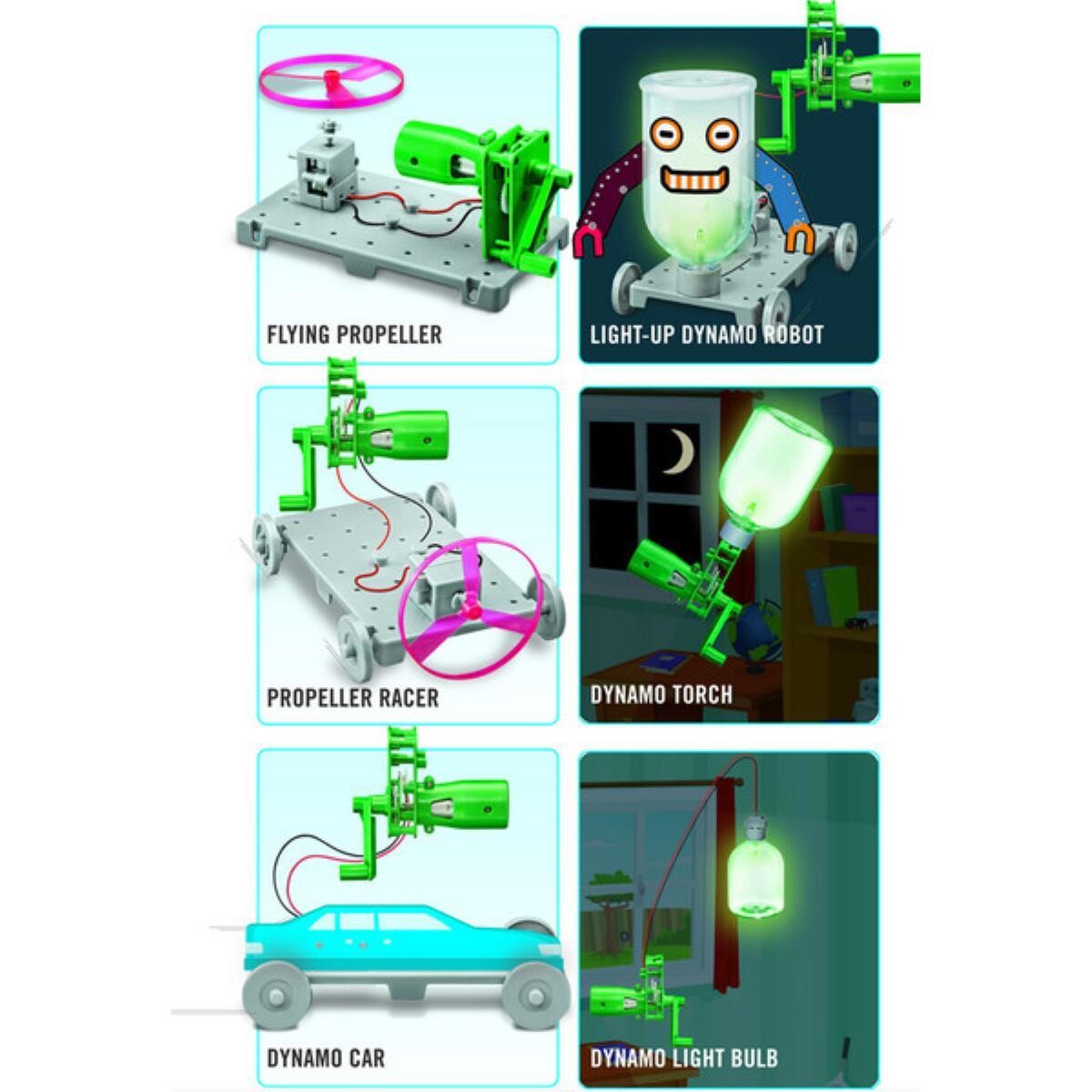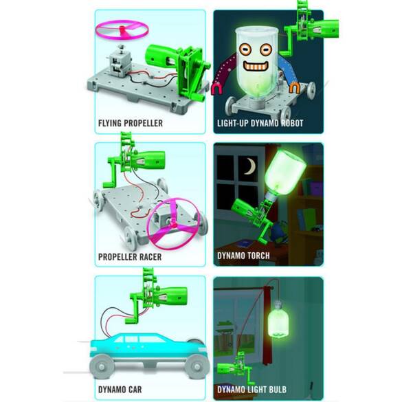 Bir dinamo ile elektriğin nasıl üretildiğini ve bir devrenin nasıl bağlandığını öğrenin. Dinamo yarış arabası, ışıklı robot, helikopter ve pervaneli araç yapın. Çevreci ve temiz enerjinin gücünü keşfedin. İçindekiler: Dinamo jeneratör, temel plaka, tekerlekler, pervane, LED ışığı, motor, vidalar, kablolar ve detaylı kullanım kılavuzu.