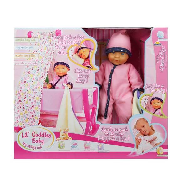 30 cm. uzunluğundaki mavi gözlü bu bebeği özel beşiğinde uyutabilir, onu beşiğinde sallayabilir ve ninniler söyleyebilirsiniz. Üstelik sevimli bebek pembe tulumu ve şapkası ile çok sevimli gözükmektedir.
