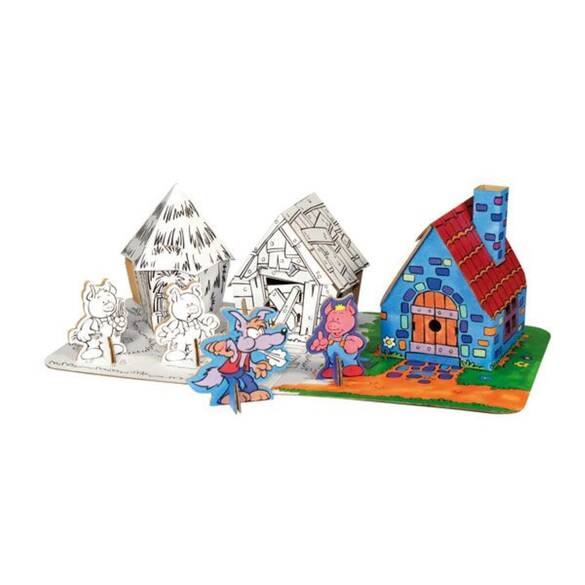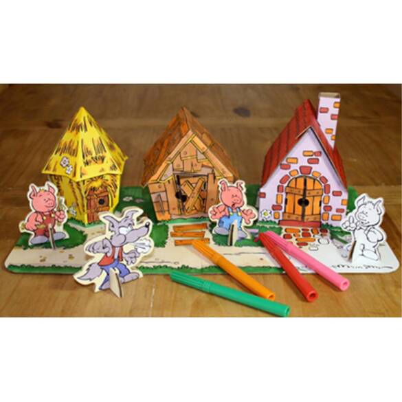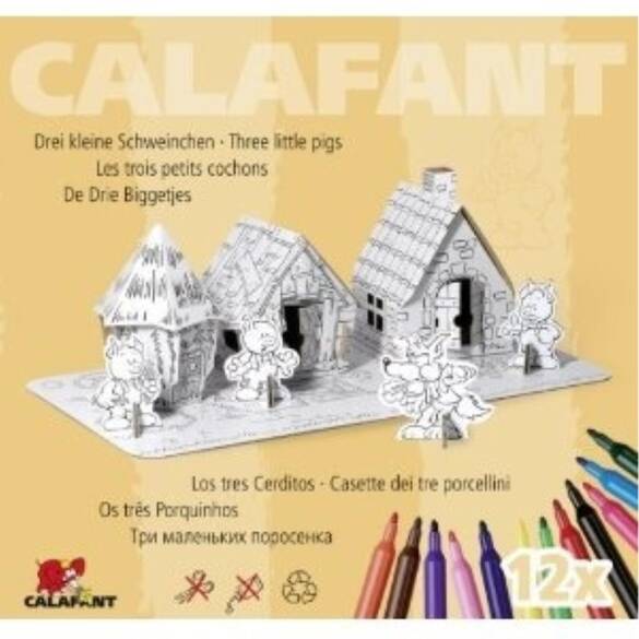 3 Küçük Domuzcuk masalının oynanabilir versiyonu... 3 sevimli ev, 3 domuzcuk, 1 kurt, 12 adet renkli boya kalemi ve oyun matı. Yapması çok kolay, boyamak ve dekore etmek çok eğlenceli, oynaması harika... Araştırmalar; dil dışında çocukların kendilerini ifade etmelerinin en önemli yolunun yaratıcılıklarını göstermeleri olduğunu ispatlamıştır. Çocuklar boyadıklarında, el-işi faaliyetler yaptıklarında, maketler inşa ettiklerinde heyecan duyarlar, tecrübe edinirler ve zorluklar karşısında kendi pratik çözümlerini bulmayı öğrenirler. Bu tip aktiviteler ayrıca çocuğun ince ve kaba motor gelişimine ciddi katkıda bulunur. Çocuk psikologları, doktorlar ve öğretmenler, çocukların yaratıcılıklarının geliştirilmesi ve desteklenmesi gerektiği konusunda hem fikirdirler. Calafant modelleri üst kalitede, geri dönüşümlü kartondan üretilmiştir. Bütün parçalar önceden kesilmiş ve katlanmaya hazır hale getirilmiştir. Makas ve yapıştırıcı kullanmadan bir araya getirilerek monte edilir. Her oyuncağın içinde resimli ve açıklamalı montaj kılavuzu ile 12 adet renkli, yıkanabilir boya kalemi vardır. İstendiği şekilde boyanabilir, süslenebilir ve dekore edilebilir. Calafant oyuncakları; kolay yapılır, boyanması ve dekore edilmesi eğlencelidir ve oynanması harikadır, çocukların yaratıcılığını ve özgüvenlerini destekler. Ürün ölçüleri: 24 x 24 x 21,5cm