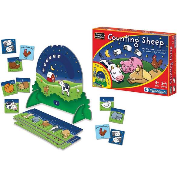 Koyun Sayma Oyunu! Koyunlar sayılmadan önce tahtasındaki hayvanları onların uyuyan hallerinin olduğu kartlarla eşleştiren kazanır! 2 ila 4 kişinin oynayabileceği oyunda, her oyuncunun bir adet oyun kartı bulunur. Bu kartta 5 farklı hayvanın resmi bulunmaktadır. Bu 5 hayvanı, ortaya arkası dönük bir şekilde koyduğunuz 20 uyuyan hayvan kartları içerisinden rastgele kart çekerek eşleştirmeye çalışacaksınız. 7 adet koyun kartı bulunmaktadır ve bu koyunların kart üzerindeki sayısı 1 veya 2 tanedir. Rastgele kart çekerken denk geldiğiniz koyun sayısı kadar 3-D Sayma Tekerin'i ilerletin. Sayma tekerindeki sayı 10 olmadan önce oyun kartınızdaki hayvanların hepsini eşleştiren kazanır! Not: 4 adet yavru horoz kartı bulunmaktadır ve yavru horoz kartını çeken oyun tahtasındaki bir hayvanı yere geri bırakmak zorundadır.