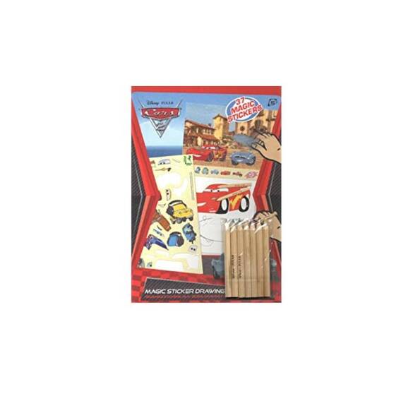 Disney Pixar Cars 2 boyama ve yapıştırma seti. Çıkartma parçalarını puzzle gibi birleştir ve ensevdiğin karakterleri çiz ve boya. 7 renkli kuru boya kalemi içerir.