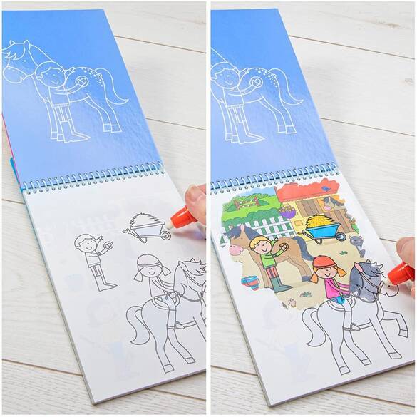 Suyla boyanabilen bu boyama kitapları çok heyecan verici! İçinden çıkan kalemi suyla doldurun ve sayfaları boyayın, sayfanın kurumasını bekledikten sonra tekrar tekrar boyayabilirsiniz. Her kitap tekrar boyanabilen 6 boyama sayfası ve 1 doldurulabilir su kalemi içerir. Bu üründe toksik olmayan boyalar kullanılmıştır. Gerekli Avrupa Birliği ve ABD oyuncak güvenlik standartlarına uygundur. Çocukların el becerilerinin gelişmesine yardımcı olur.