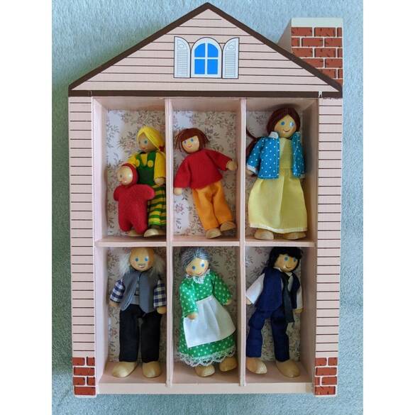 Yedi adet figürden oluşan ahşap bebek evi aile seti.