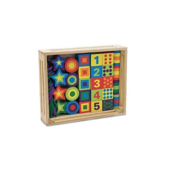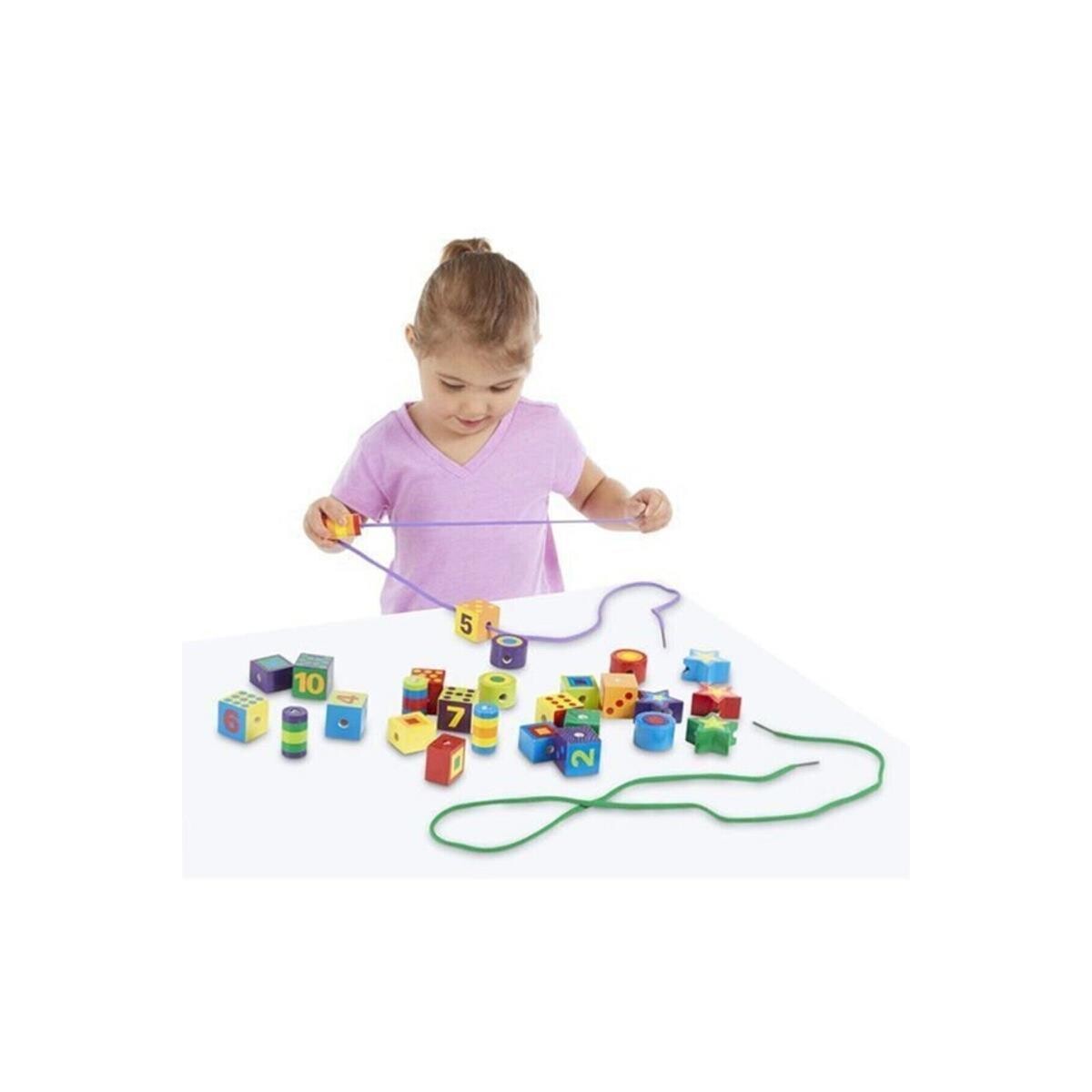 Farklı şekillerdeki ve göz alıcı renklerdeki ahşap boncuklar uzun iplere dizilebilir. Elde boyanmış 27 adet ahşap boncuk ve 2 adet uzun ipten oluşur. Rakamlar ve boncuklar üzerindeki noktalar ile sayı sayma aktivitesi de yapılabilir. Çocukların el göz koordinasyonunu, ince motor becerilerini ve görsel algılamalarını geliştirir. Bu üründe toksik olmayan boyalar kullanılmıştır, gerekli Avrupa Birliği ve ABD oyuncak güvenlik standartlarına uygundur.