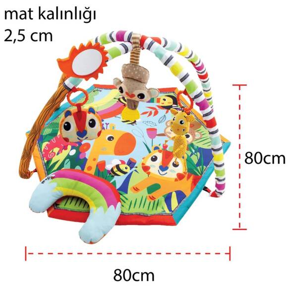 Yumuşak zemin sayesinde, bebeğinizi gönül rahatlığıyla yatırabilirsiniz. Halının üzerindeki çeşitli oyuncaklar ve figürler sevimli miniklerin görsel ve bilişsel zekasının gelişimine katkı sağlar. El ve göz koordinasyonunun gelişimini de destekler. Sahip olduğu özel yapısı sayesinde, bebeğinizin sağlığına zararlı hiçbir kimyasal madde barındırmaz. Kolay kurulumu ile dilediğiniz yere taşıyabilir ve bir kaç dakika içerisinde kullanıma hazır hale getirebilirsiniz. Set içerisinde oyun halısına ek olarak 2 adet boru, 4 adet askılı oyuncak (Çınçınlı Zürafa, Dişlikli Maymun, Hışırtılı Kaplan, Sert Plastik Şekilli Ayna), 3 adet oyuncak askısı ve 1 adet şekilli oyun yastığı bulunmaktadır. Ürün Ölçüsü: 80 x 80 cm