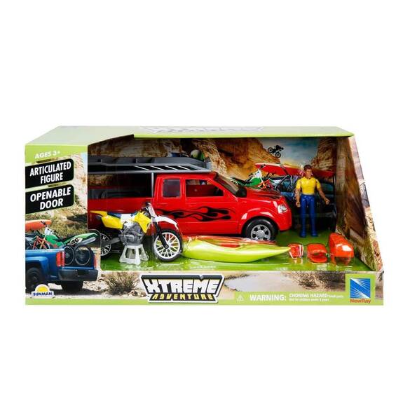 Kutu İçerisinde; Kırmızı pikap; 1 adet erkek figürü, kano, motosiklet, 1 adet kırmızı pikap, can yeleği ve kamp aksesuarları içerir.