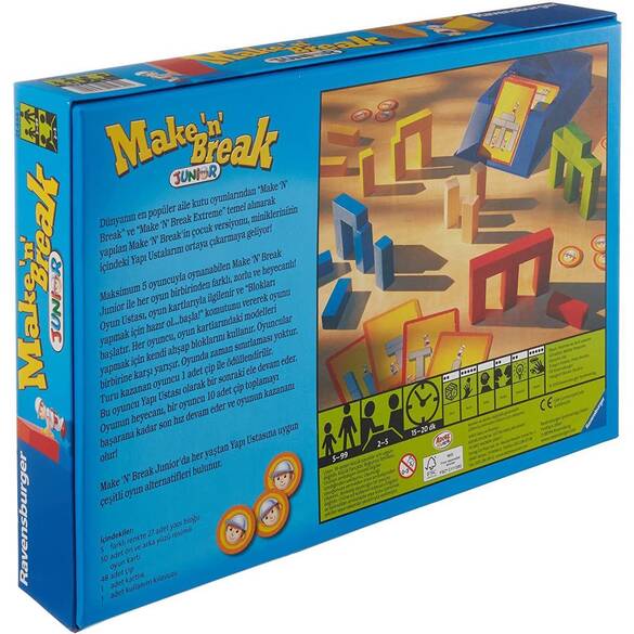 Make'n Break Junior ile arkadaşlarınız ve ailenizle birlikte eğlenceli dakikalar geçirin! Dünyanın en popüler aile kutu oyunlarından Make'n Break ve Make'n Break Extreme temel alınarak yapılan Make'n Break'in çocuk versiyonu, miniklerinizin içindeki ‘Yapı Ustalarını’ ortaya çıkarmaya geliyor! Make'n Break Junior Nasıl Oynanır? Her oyuncu aynı anda kendine ait bloklarla görev kartındaki yapıyı hızlı ve doğru şekilde inşa etmeye çalışır. Oyun sonunda en fazla puan taşı olan kazanır. Kutu içerisinde; 5 farklı renkte 27 adet yapı bloğu, 50 adet görev kartı, 48 puan taşı, 1 kart tutucu ve kullanım kılavuzu yer almaktadır. Oyun kılavuzunda 2 kişi için ve genç-yetişkin için farklı oynama şekilleri de bulunmaktadır. Oyuncu sayısı: 2-5
