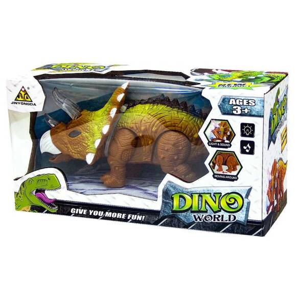 İnce detay tasarımına sahip dinozor ile oynamak çok eğlenceli. Gerçekçi görünümlü dinozor yürüyebilir ve boynuzlarında ışık çıkarır. Dinozor 25 cm uzunluğundadır. 3 adet 1.5V AAA tipi pil ile çalışmaktadır. (Piller dahil değildir.)